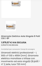 Girarrosto 8 polli per volta, 2 aste girevoli e 2 serpentine che cuociono insieme o separate , cottura in circa 1 ora e mezza, ottime condizioni generali, utilizzato per rosticceria, si vende per cessione attività, ottimo prezzo considerando che nuovo costa circa 2400 euro.