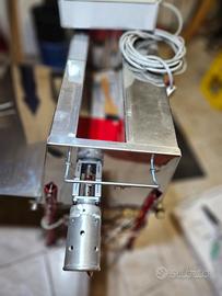 È realizzato in lamiera di acciaio inox AISI 430 con gambe e mensole in acciaio verniciato. È dotato di un braciere laterale e la cottura è prevista con la brace. Consigliamo che la brace venga inserita già rossa per evitare fumo che potrebbe “macchiare” il cibo. Il materiale usato è facile alla pulizia e garantisce un’ottima durata. Il girarrosto è dotato di motore elettrico.