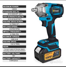 GISAM 1200N.M Avvitatore Brushless 1/2'' 18V Compatibile con Batterie Makita.