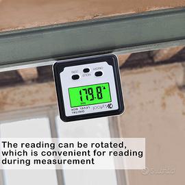 INCLINOMETRO DIGITAL:La base magnetica incorporata può essere fissata saldamente a qualsiasi superficie metallica per misurazioni e tagli precisi, semplificando la lavorazione del legno, la costruzione e altre attività. In particolare, il inclinometro digitale è molto adatto per la regolazione dell'inclinazione della lama di seghe da banco e troncatrici