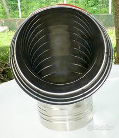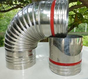 Gomito tubo per canna fumaria, terminale con connessione filettata da 1", e piccolo elemento diritto, tutti inox diametro 140 mm, come nuovi. Dimensioni gomito mm 285 x 290; lunghezza elemento diritto mm 140. Disponibile per la spedizione.