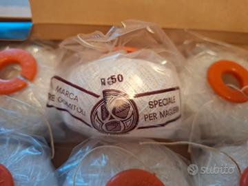 10 gomitoli da 50 grammi cadauno n.8 di colore bianco, con anello sfilatore brevettato. In scatola originale rovinata. Marca Tre gomitoli Cucirini 3 stelle