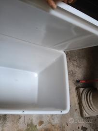 L'oggetto nell'immagine è un contenitore di plastica che può essere utilizzato come vasca di quarantena per pesci o altri animali acquatici o per deposito oggetti da riparare.