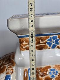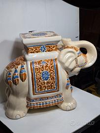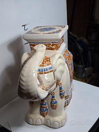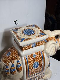 Elefante portafortuna porta piante o complemento d'arredo in ceramica spesso descritto come in stile asiatico e risalente agli anni '70 realizzato in ceramica smaltata e spesso utilizzato sia come elemento decorativo che come supporto per vasi o seduta , in buone condizioni senza rotture i segni mostrati nelle foto sono dovuti alla cottura dello smalto non è un difetto e dato il valore e la natura del bene assicuratevi di aver valutato bene l'acquisto . Ceramica policroma smaltata, decorata a mano con decorazioni in rilievo nei toni del bianco, blu e marrone, con motivi ornamentali e simboli, La proboscide alzata è considerata un simbolo di buona fortuna e saggezza.