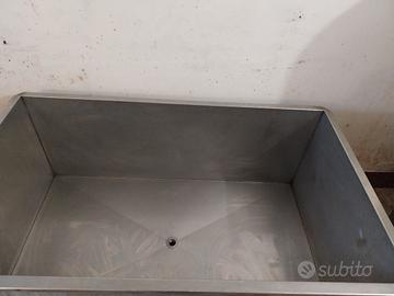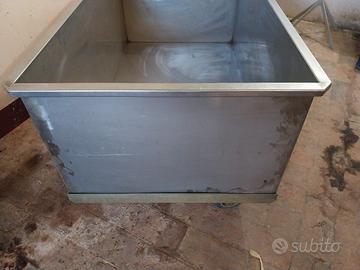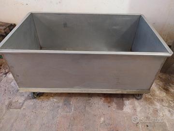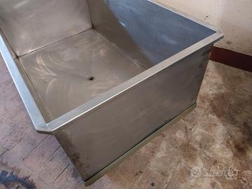 Questa vasca ha la struttura in acciao inox e il carrello in ferro zincato, ha un rubinetto di scarico nella parte sotto. Ha dimensioni di: altezza totale da terra compreso il carrello 74 cm, dimensioni interne: altezza/ profondità interno vasca 55 cm, lati 140×80 cm, spessore della lamiere 2 millimetri.