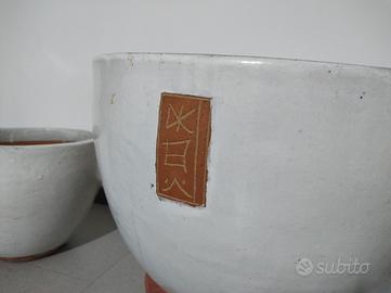 Set composto da n. 3 grandi vasi porta piante in terracotta di varie dimensioni (graduale/crescente), verniciatura bianco lucido con dettaglio simbologia cinese/orientale.