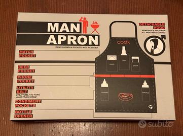 Questo grembiule nero è dotato di tasche per contenere separatamente birra, fiammiferi, telefono, ketchup e senape.
