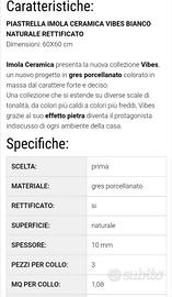 Per ordine in eccesso, vendo di 20mq di gres porcellanato IMOLA effetto pietra, colorato in massa colore marmo bianco, dimensioni 60x60 e spessore 1cm. Le piastrelle sono ancora nell'imballo originale e sono disponibili immediatamente.