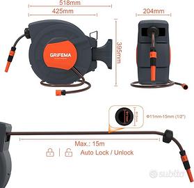 【Sistema di riavvolgimento automatico】 Questo avvolgitubo GRIFEMA fornisce un avvolgimento automatico regolare, che assicura che il tubo da giardino sia avvolto in modo ordinato e senza attorcigliamenti o grovigli.sa per una maggiore protezione dall'usura.