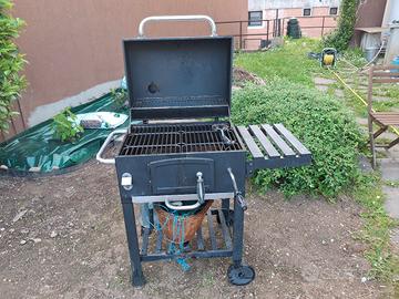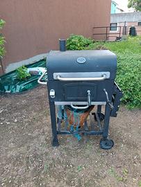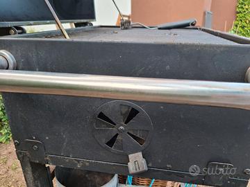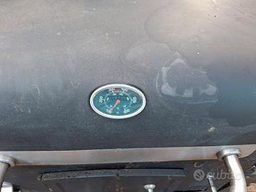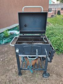 Griglia a carbonella con termometro per controllare la temperatura, griglia per tenere i cibi in caldo, doppia ventilazione, camino. piano di lavoro esterno con ganci per attrezzi.