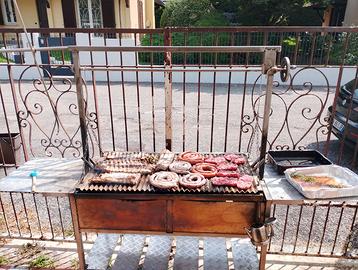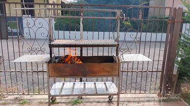 Salve ... Vendo splendido barbecue a legna completamente inox con saldatura a filo continuo, la griglia ha lunghezza di un metro per mezzo metro di larghezza con angolare 20x20 spesore 4 con canalina e contenitore raccolta olio, come si può vedere dalla foto la griglia e regolabile con apposita maniglia e cuscinetto in base all' altezza che si desidera per il fuoco/ brace; il cassone per la brace ha una lunghezza di un metro e mezzo metro di larghezza anche loro con gli appositi fori laterali e sottostante per poter mantenere le teglie e la carne calda man mano pronta.. il basamento sotto è stato fatto con lamiera in alluminio e porta teglie superiori anche la struttura griglia e tutta di tubolare 30x30 spessore 4 millimetri sono stati fatti dei forellini sul tubo in modo da buttare fuori la condensa che si forma con gli anni in qualsiasi tubo le ruote sono cambiabili xchè sono avitate se negli anni si dovessero consumare a due maniglie per trasporto ho spostamenti in più a una barra smontabile dove poter agganciare appositi attrezzi per grigliare se interessati seriamente e senza proposte ridicole come è successo solo per veri intenditori del lavoro che c'è stato dietro e dell materiale la griglia la vendo a 600 EUR0 non trattabili per altre foto e dettagli scrivetemi pure Michele PS e stata usata solo due volte vendo a malincuore per passaggio a griglia in muratura