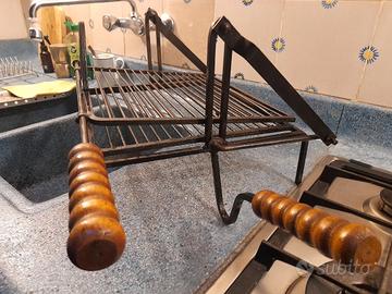 E' adatta per cuocere carne e pesce. La griglia basculante consente di ruotare una bistecca o un sarago con facilità. Misura 36 cmx36. I piedini di appoggio sono alti 10 cm. I manici sono di legno. Vendo per non utilizzo.