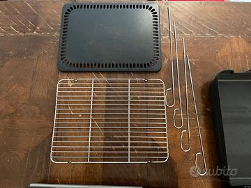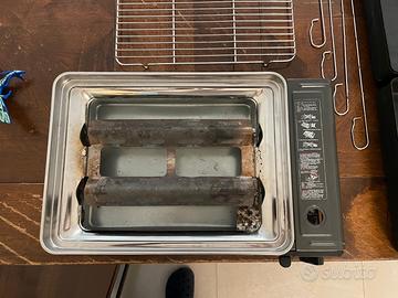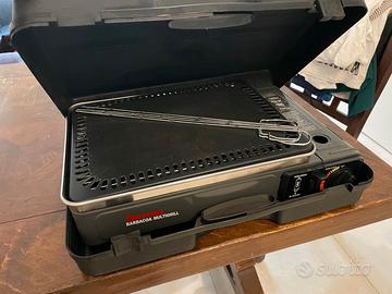 Vendo come da foto griglia/piastra bbq portatile, perfetta per campeggio, accensione piezoelettrica, alimentazione doppia: cartucce gas da campeggio o attacco bombola propano; valigetta per storage.