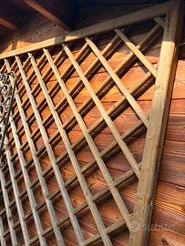 Vendesi robusto e bellissimo pannello grigliato in legno massiccio con trama a rombi, ideale per decorare pareti esterne, balconi, come protezione da sguardi indiscreti o per piante rampicanti.