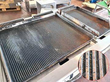 grigliatrice doppia per ristorante usata, si tratta di una griglia rigata professionale a gas in acciaio inox mod. GBP/45-R del 2009 dotata di cassetti per scarico grassi e porta teglie inferiore.