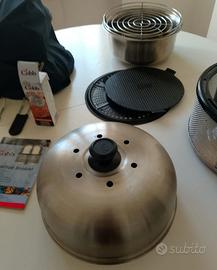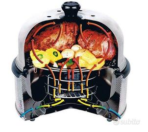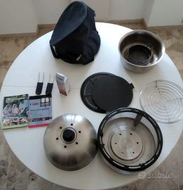MULTIGRILL DA TAVOLO O GIARDINO COB USATO UNA VOLTA IN PERFETTE CONDIZIONI. Cobb pesa solamente 4,5 kg ed è pratico da trasportare in caso di viaggi o da spostare (terrazza, balcone, ecc). Non produce fumo, quindi non inquina e non disturba i vicini. Ha una capacità di cuocere cibo per fino a 6 persone. Con Cobb è possibile cucinare direttamente in tavola senza rischiare ustioni poichè è completamente freddo all’esterno. Il disegno elegante lo rende piacevole da usare direttamente sul tavolo. Caratteristiche tecniche: Il grill Cobb è facile da usare. E’ costituito da una base in acciaio inossidabile formata in modo da aspirare l’aria internamente. L’aria forma una camera isolante, la quale fa in modo che l’esterno del grill non si surriscaldi. Il contenitore interno si solleva, nel fondo c’è la camera di combustione. Attorno al castello dell bricchette c’è un canaletto per la raccolta dei grassi nel quale, volendo, si può versare vino o birra per infondere alle pietanze sapore e tenerezza.