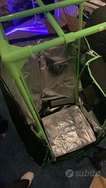 grow box, luce con opzione di crescita o fioritura, prese timer, ventole e tubo di areazione in alluminio.