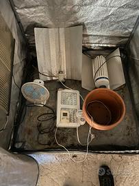 Vendo Grow box per coltivazione indor usata completa di tutto il necessario. Ventilatore aspiratore, telo scaldante, timer , controllo temperatura e 4 lampade 2 led potenza dai 250kw a 150kw tutto usato 9 mesi