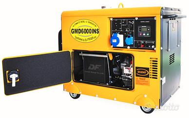 Gruppo elettrogeno generatore di corrente silenziato diesel ad avviamento automatico mod. GMD6000INS nuovo modello da 7.5kVA con motore diesel ad iniezione diretta, Monofase 230V.c.a.,50Hz-, COMPLETO DI QUADRO AD INTERVENTO AUTOMATICO (ATS) SERIE GATS8.5. Emissioni "Euro 5". CARATTERISTICHE TECNICHE: Potenza stand-by monofase: 7,00kVA pari a 5,60kW Potenza continuo monofase: 6,50kVA pari a 5,20kW Tipo Motore: 4 tempi DIESEL I.D.; Cilindrata: 438 c.c.; Giri Motore: 3.000 g/min.; Potenza (HP/rpm): 10,00/3.000; Raffreddamento: Aria Forzata; Classe Emissioni : Euro 5; Tensione: 230V.c.a.-MONOFASE; Tipo di regolatore: ELETTRONICO "AVR-S"; Corrente: 24 Amp.; Frequenza: 50 Hz; Caricabatteria: 5Amp. 12V.c.c.; Grado d'isolamento: IP23S; Avviamento: ELETTRICO o AUTOMATICO + BATTERIA AL P.B.; Serbatoio: 14.5litri ; Autonomia: 10 ore ; Rumorosità: 70dB(A) a 7mt.; Dimensioni: 91.0X53.0X74.0 cm; Peso: 155kg. Fornitura completa di quadro automatico ATS serie GATS8.5 : La centralina automatica GATS-8.5 può essere installata su tutti i generatori MR.GENERATOR di tipo SILENT E SUPERSILENT da 5 a 70kVA. Questo accessorio consente al gruppo elettrogeno di avere le seguenti funzioni: "Commutazione automatica "Consente al generatore di avviarsi automaticamente in caso di black-out elettrico e di scollegarsi automaticamente dalla rete a fine emergenza spegnendolo. Consente di mantenere la batteria del gruppo elettrogeno sempre carica. "Esercizio automatico "Test automatico di funzionalità" con cadenza mensile, programmabile dalla centralina. Questa funzione verifica periodicamente il buon funzionamento dell'apparato. Controllo remoto: La centralina GATS-8.5 è fornita di led luminosi e di un microprocessore che mantiene costantemente sotto controllo ogni funzione del motore e del gruppo elettrogeno. Protezione impianto anche da guasti di rete (sbalzi di tensione o frequenza). GARANZIA 24 MESI - IVA INCLUSA - CONSEGNA E RITIRO A DOMICILIO