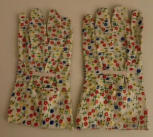 Guanti da giardinaggio in cotone con fantasia floreale colorata.