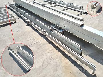 guidovia per suini e ovini usata, si tratta di una rotaia in alluminio con supporto strutturale portante per la movimentazione delle carrucole (non disponibili). si sviluppa con una parte esterna di cui non conosciamo la disposizione e una parte interna cella formata da almeno 5 rotaie parallele ad anello con relativi scambi. purtroppo non riusciamo a dare altre indicazioni sulla struttura perché l'abbiamo ritirata smontata, possiamo comunque dire che ci sono le seguenti quantità di struttura: