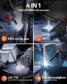 【Saldatrice Multifunzione 4 in 1】Combina saldatura MIG no gas, ARC (saldatrice elettrodo), Lift TIG e Spool Gun. Questa saldatrice a filo continuo 4 in 1 è versatile per progetti fai-da-te e lavori industriali.