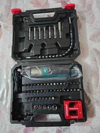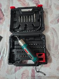 Cacciavite elettrico portatile con custodia. - Custodia nera resistente. - Inserti rossi. - Logo del marchio visibile.