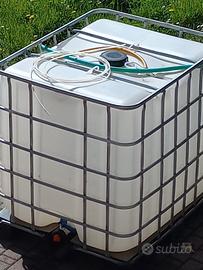 vendo IBC cisterna con capacità 1000 litri pianale in bancale di plastica resistente e gabbia zincata completo di rubinetteria adatto ad orti,giardini o riserve di acqua.