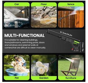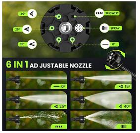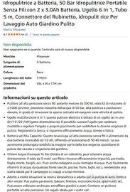 Idropulitrice a Batteria, 50 Bar Idropulitrice Portatile Senza Fili con 2 x 3.0Ah Batteria, Ugello 6 In 1, Tubo 5 m, Connettore del Rubinetto, Idropulit rice Per Lavaggio Auto Giardino Pulito Pulitore ad alta pressione senza fili: potente motore da 300 W, velocità di rotazione di 21.000 giri/min, pressione massima dell'acqua di 50 bar, alta potenza e prestazioni elevate, in grado di rimuovere lo sporco ostinato ed eseguire varie attività di pulizia. Ugello multifunzione 6 in 1: questo pulitore elettrico è dotato di un ugello sei in uno (0°/15°/25°/40°/getto diretto/doccia). È possibile ruotare l'ugello per cambiare modalità e regolare l'angolo a proprio piacimento per soddisfare le diverse esigenze di pulizia. Regolando la lancia, si risparmia efficacemente acqua, tempo e fatica. Batteria ad Alta Capacità: Questo lavasciuga ad alta pressione senza fili è alimentato da due batterie ricaricabili da 3,0 Ah, offrendo un'autonomia di 30-40 minuti. La sua autonomia prolungata soddisfa la maggior parte delle tue esigenze quotidiane di pulizia del veicolo e irrigazione del giardino. Ottieni Acqua Ovunque Tu Sia: Dotato di un rubinetto, puoi ottenere acqua direttamente. Il tubo da 5 metri con filtro rimuove efficacemente impurità, particelle, foglie morte, fanghi, ecc. Puoi anche collegarlo a una bottiglia d'acqua. Puoi facilmente rifornirti di acqua da qualsiasi fonte (secchi, piscine, fiumi, laghi, ecc.), rendendolo una scelta ideale per il campeggio e i viaggi a lungo termine. è NUOVO....NO OFFERTE NO TRATTABILE SE C'è è DISPONIBILE