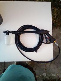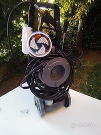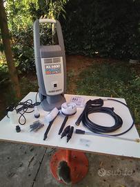 Idropulitrice Comet KL 1400 Extra super accessoriata, compresa di lancia con tubo ad alta pressione di 8 metri. Due ugelli intercambiabili, uno per getto lineare regolabile e l'altro per getto rotante. Serbatoio applicabile su lancia per getto schiumogeno, filtro acqua trasparente in entrata. Spazzola rotante con setole + spazzola fissa. Piccola e compatta, con una pressione di 140 bar, una portata di 410 litri/ora. Motore a induzione da 1,4 kw, con pompa assiale a tre pistoni. Prodotto nuovo, made in Italy, usato per prova 10 min. e poi rimasta ferma in garage. La plastica frontale, come si vede in foto, l'ho fissata con due fascette, perché quando mi è arrivata, non stava ben aderente alla scocca. Per chi è interessato, al costo di 25€ l'uno, posso fornire, oltre agli accessori in dotazione, anche una spazzola lavapavimenti e una sonda sturatubi da 15 metri, tutto compreso di adattatori per le varie idropulitrici, nuovi, mai usati.