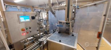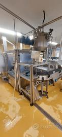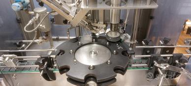 Monoblocco composto da serbatoio termostatato, imbottigliatrice pneumatica a doppio pistone e tappatrice a stella.