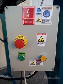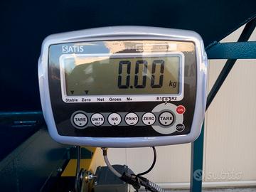 Insacchettatrice semi-automatica con tramoggia e convogliatore a nastro dotata di bilancia di precisione e sistema di chiusura sacchi a caldo.