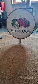 Insegna in metallo e laminato proveniente da negozio di articoli sportivi. Può essere avvitata o appoggiata. Colori rosso e bianco con disegno e scritta Fruit of the Loom.