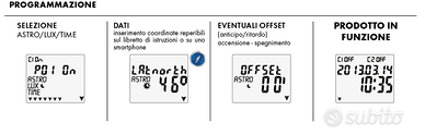 Interruttore orario astronomico crepuscolare "ASTRO-LUX-TIME" 2 canali - 2 DIN, display retroilluminato, Zero Crossing, intervento minimo 1 minuto, vetrino incernierato e piombabile, 45 programmi ON + OFF