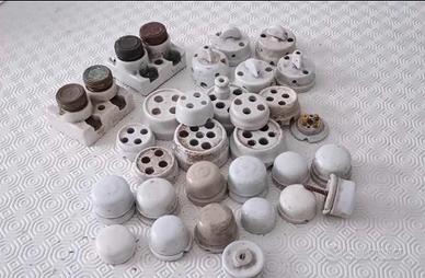 Vecchio materiale elettrico vintage. Portalampade in ceramica, rubaluce, applique da parete e interruttori deviatori vintage, scatolette di derivazione in porcellana.