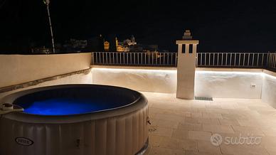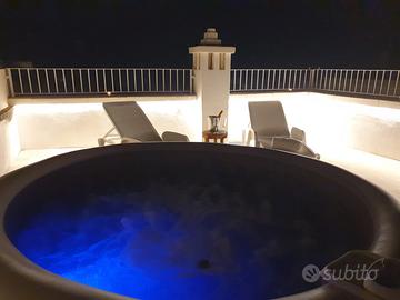 piscina idromass. da ext con luce led, motore per riscaldamento e idromassaggio, pompa immersione per svuotamento rapido, poggiatesta, portabevande, doppio motore in aggiunta, possibilità di acquisto dei lettini prendisole