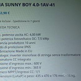 Come da titolo vendesi Inverter per impianto fotovoltaico SMA Sunny Boy 4.0 1AV-41 come nuovo usato solo un anno con ancora 8 anni di garanzia del produttore e possibilità di montaggio dal tecnico che lo ha installato precedentemente.