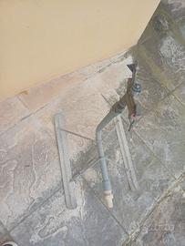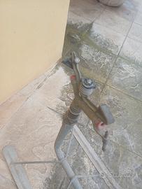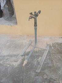Irrigatore a pioggia montato su una base a slitta, utilizzato per l'irrigazione di giardini e orti. Tipo: Irrigatore rotante o a battente su slitta metallica. Materiale: Struttura generalmente in metallo (zinco o acciaio) con componenti in ottone. Funzionalità: Copertura circolare o regolabile a settori (da 0 a 360°). Vantaggi: Facile da spostare grazie alla base a slitta, ideale per impieghi prolungati.