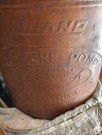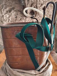 Vendo splendida irroratrice agricola in rame massiccio marca Aello, originale degli anni '50. Scritta in rilievo: " La migliore pompa - Marca di garanzia - Aello" perfettamente leggibile. L'irroratrice è completa di: lancia in ottone, tubo, pompa manuale, cinghie per il trasporto. Condizioni molto buone, ottima per collezionisti, arredamento rustico, agriturismi, o come pezzo decorativo vintage.