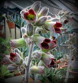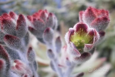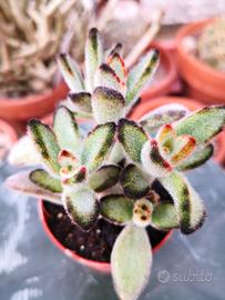 Pianta perenne originaria del Madagascar, comunemente nota come "Panda Plant" o "orecchie di gatto". Il nome le deriva a causa delle sue foglie carnose che sono ricoperte da una fitta peluria bianca argentata, (che le conferisce un aspetto vellutato), e dai bordi con caratteristiche macchie scure che sfumano dal marrone al nero. All’inizio della primavera produce fiori campanulati di colore giallo-verde con petali rosso scuro riuniti in infiorescenze a pannocchie. Esemplare perfettamente radicato con ben 3 fusti. - Ideale per collezionisti di piante grasse.