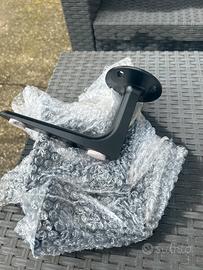 In alluminio verniciato nero, altezza da terra 12 cm profondità 18 cm attacco 4 fori avasati con interasse 4,2 cm.