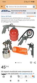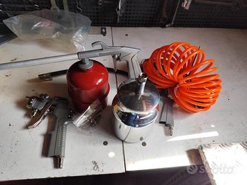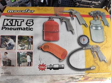 Mecafer Kit 5 Pneumatic (modello 9045313), un set di accessori per compressori d'aria progettato per lavori hobbistici e semiprofessionali. Contenuto del kit: Include una pistola di verniciatura con serbatoio da 1 litro, una pistola di gonfiaggio con manometro, una pistola di soffiaggio, una pistola nebulizzatrice e un tubo a spirale da 5 metri. Utilizzi: Ideale per verniciare, soffiare, gonfiare pneumatici e nebulizzare liquidi/lavare. Caratteristiche: Gli accessori sono dotati di attacchi rapidi per una facile connessione al compressore. altre foto su richiesta