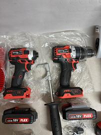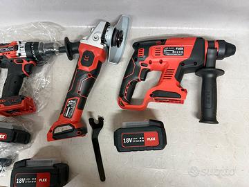 Vendo kit della flex composto da trapano avvitatore / avvitatore ad impulsi / tassellatore compatto / smerigliatrice 125 mm, completo di 4 batterie, due da 2.5 ah e due da 5 ah, caricabatterie rapido e borsone in stoffa con fondo rigido, TUTTO NUOVO MAI USATO !