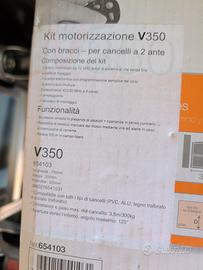 Vendo kit motorizzazione a pistoni per cancelli a due battenti modello V350. Il prodotto è nuovo, mai installato e ancora nella sua confezione originale.