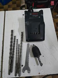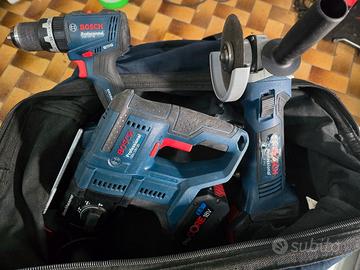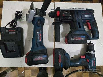 Tassellatore GBH 18V-20 + Smerigliatrice GWS 18V-LI + Avvitatore a percussione GSB 18V-65 con KICKBACK ( si spegne alla rotazione improvvisa del gomito). 3 batterie PROCORE da 8Ah, completo di caricabatterie veloce e borsa per il trasporto e accessori