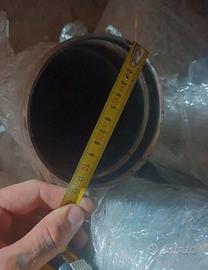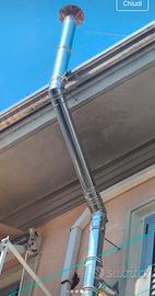 In vendita kit completo di canna fumaria in acciaio inox monoparete, diametro 120mm. Il lotto comprende circa 10 metri di tubo (prevalentemente elementi da 1 metro), curva/ginocchio, cappello parapioggia e piastra passatetto. Materiale in buone condizioni, smontato da installazione. Ideale per stufa a legna o pellet.