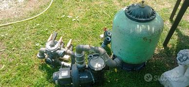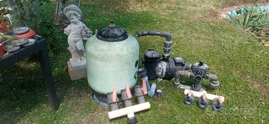 Sistema di filtrazione a sabbia completo di: Filtro a sabbia ( manca solo il manometro da pochi euro), pompa di circolazione, valvola selettrice, collettori con valvole a sfera, locale tecnico in vetroresina da interrare. Tutto funzionante, solo da pulire. C'è da rimettere la sabbia al filtro. Ritiro esclusivamente in loco.