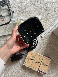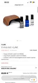 Kit per unghie Peggy Sage con prodotti per la manicure. - Occhiali protettivi. 1 base UV/LED I-LAK 11ml 191000, 1 top finish UV/LED I-LAK 11ml 191001, 1 colore I-LAK 11ml 1 lampada LED 12 W MINI - in omaggio! 1 foglietto illustrativo dettagliato. 1 lima
