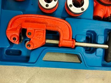 Il kit comprende 6 filiere di diverse misure, due manici per le rispettive filiere, un tagliatubi, una tenaglia e un kit guarnizioni per filetti (pezzo piccolo azzurro e bianco).