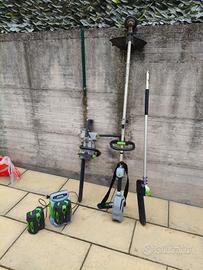 kit composto da: decespugliatore + accessorio taglia siepi, motosega, due batterie al litio da 56 e.
